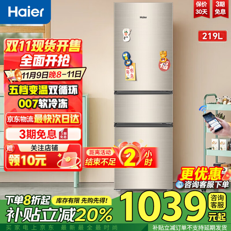 包邮 海尔冰箱219升三开门冰箱小型家用电器宿舍租房小冰箱多温区保鲜冷冻节能低噪超薄国家补贴以旧换新 219升三门直冷节能丨007软冷冻